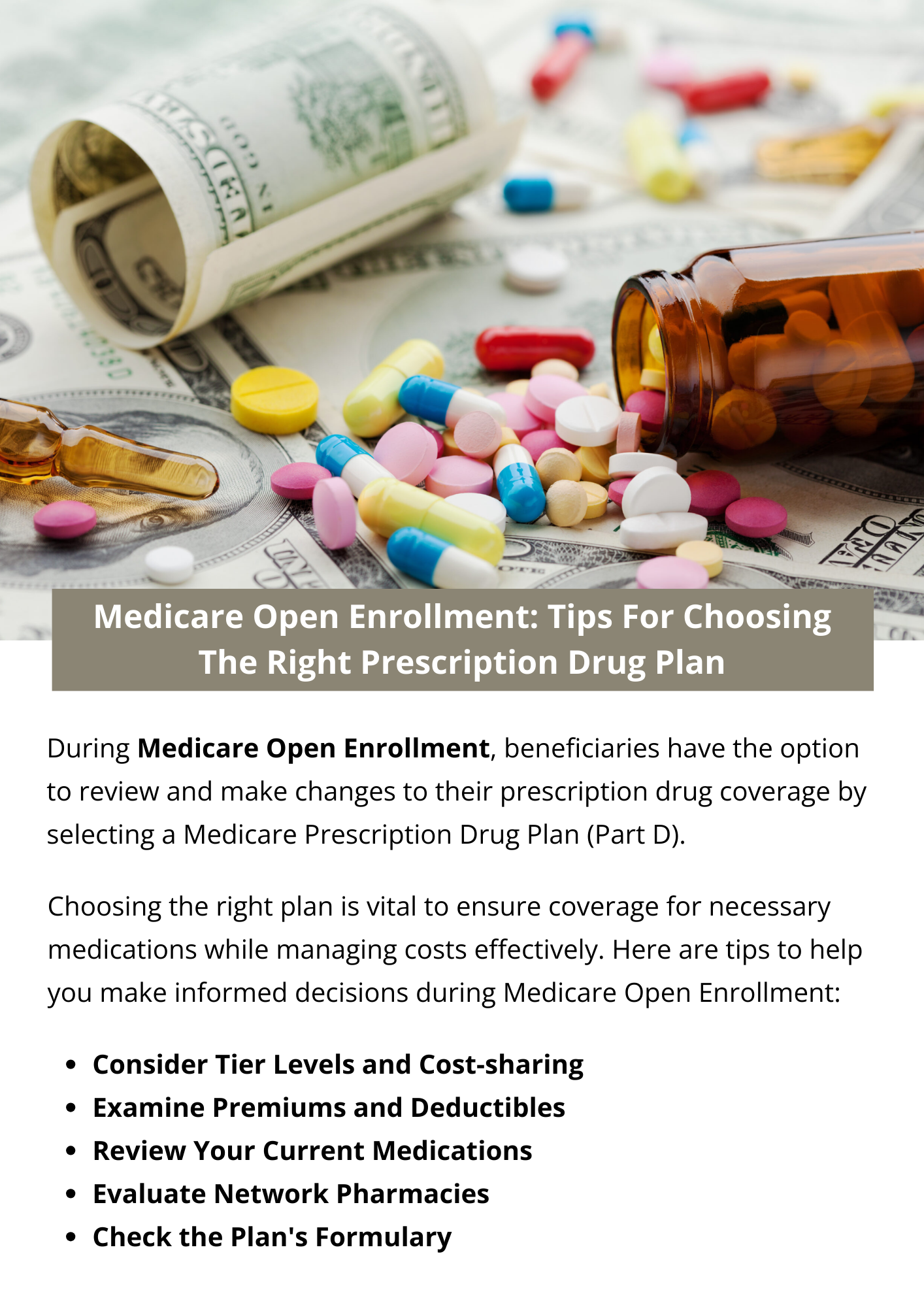 During Medicare Open Enrollment, beneficiaries have the opportunity to review and make changes to their prescription drug coverage by selecting a Medicare Prescription Drug Plan (Part D). By carefully considering these tips, beneficiaries can navigate Medicare Open Enrollment with confidence, ensuring that their chosen Prescription Drug Plan aligns with their specific medication needs, budget, and preferences.