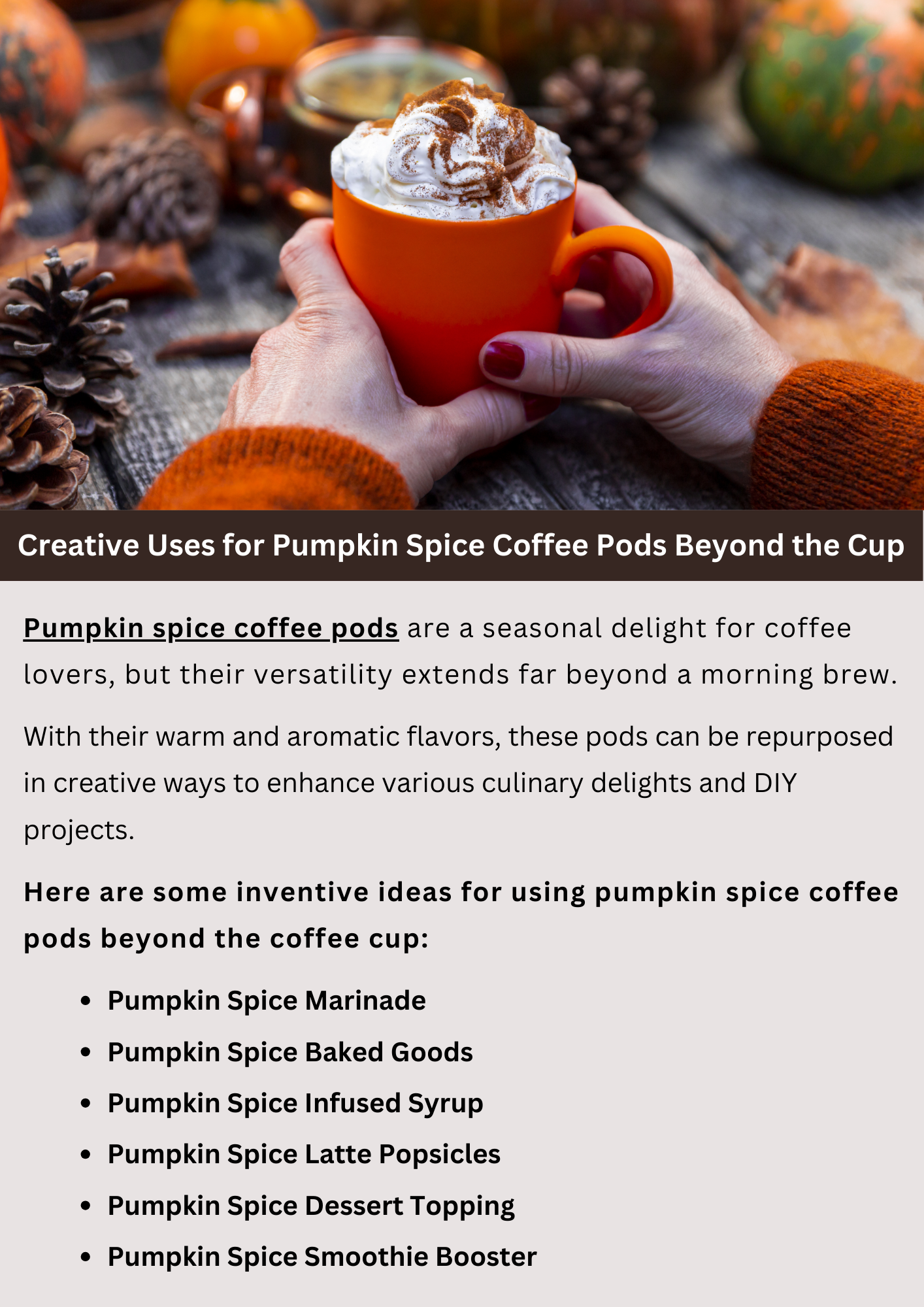 Explore creative ways to use pumpkin spice coffee pods beyond your morning brew. These versatile pods can be used to infuse flavor into various recipes, from baked goods like muffins and cookies to desserts like cheesecake and pudding. Create delicious pumpkin spice lattes or add a dash to your favorite smoothie for a seasonal twist.