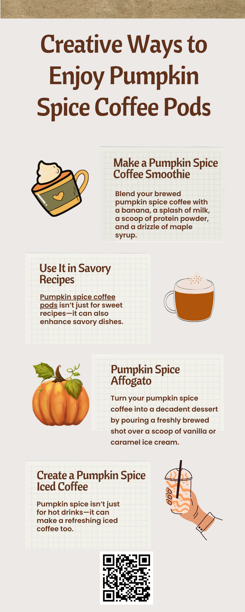 Pumpkin spice coffee pods offer endless possibilities beyond a simple cup of coffee. Enjoy them as lattes, iced drinks, or blended into smoothies. Use brewed coffee in baked goods, savory marinades, or as a base for hot cocoa fusions. Create unique desserts like affogatos or freeze coffee into ice cubes for chilled drinks. These pods bring autumn flavors to your kitchen in fun, creative ways.
