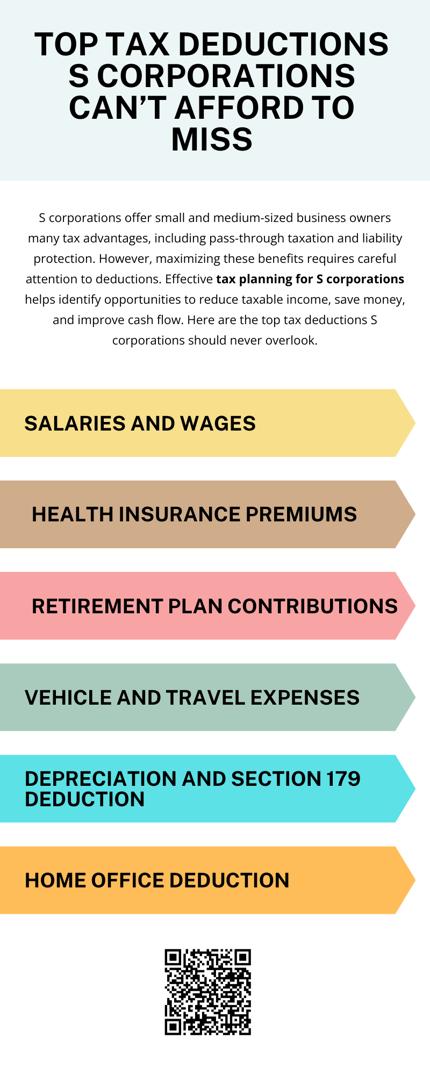 S corporations should take full advantage of deductions such as salaries, health insurance premiums, retirement contributions, business expenses, travel, depreciation, professional services, home office costs, marketing, and training. By incorporating effective tax planning for S corporations and carefully documenting these expenses while following IRS guidelines, S corporations can reduce taxable income, improve cash flow, and strengthen their financial position.