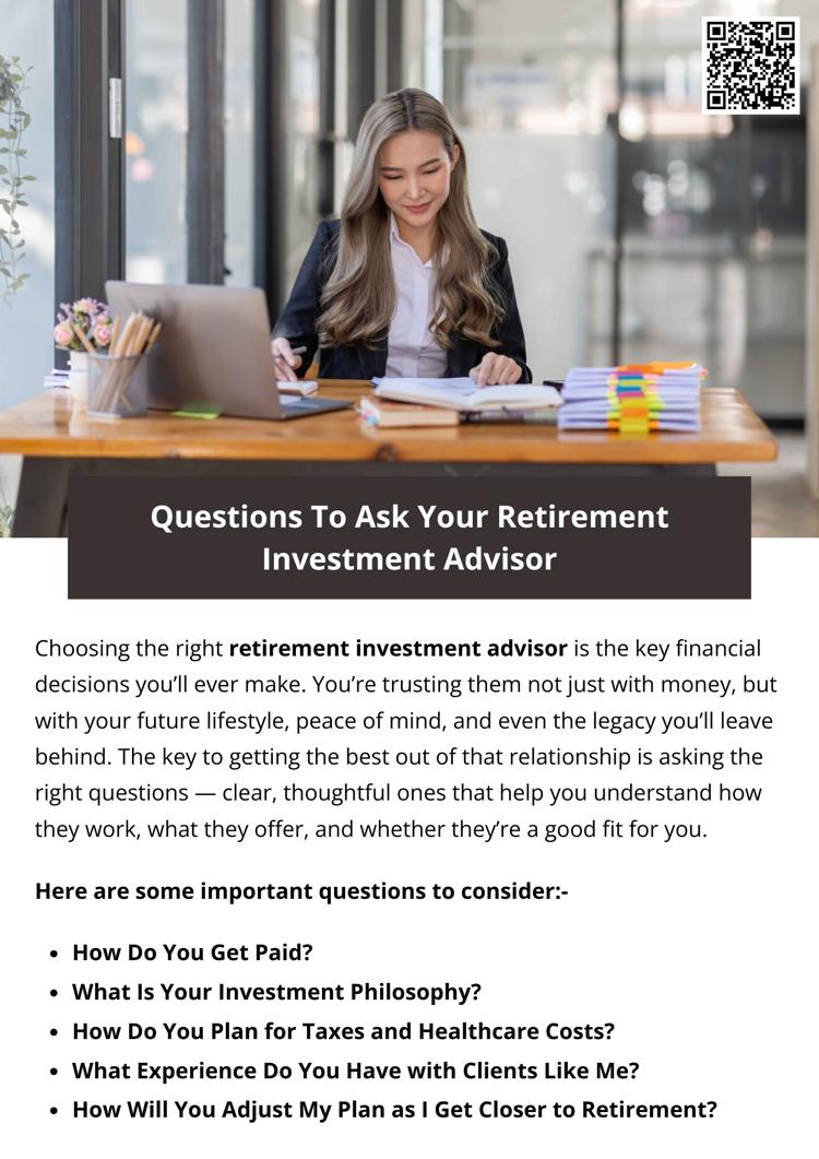 Asking the right questions early builds trust and clarity. It helps you feel confident that your advisor understands you — not just your money — and is prepared to help you retire on your own terms. Don’t be shy. A good retirement investment advisor will welcome your questions and answer them with honesty, patience, and expertise.
