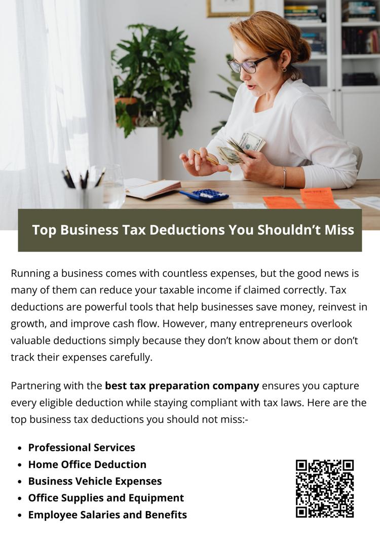 Missing eligible deductions means paying more tax than required — something no business owner wants. With a clear checklist and, when necessary, guidance from the best tax preparation company, you can ensure that every legitimate deduction is claimed, your liability is minimized, and more of your hard-earned money stays where it belongs — in your business.
