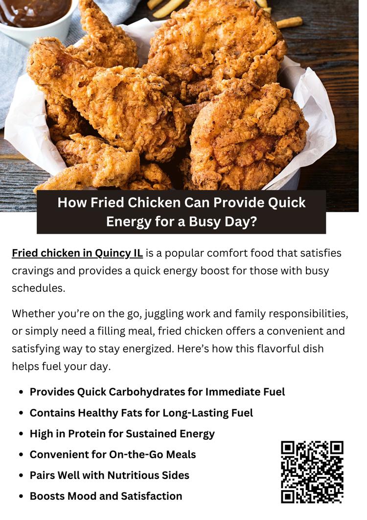 Fried chicken in Quincy, IL, provides quick energy for a busy day with its high protein content, quick-digesting carbohydrates, and healthy fats. It offers sustained fuel, keeping you full and energized. Its convenience makes it an easy on-the-go meal, while its satisfying taste boosts mood. Pairing it with nutritious sides enhances its benefits, making it a flavorful and energizing choice.