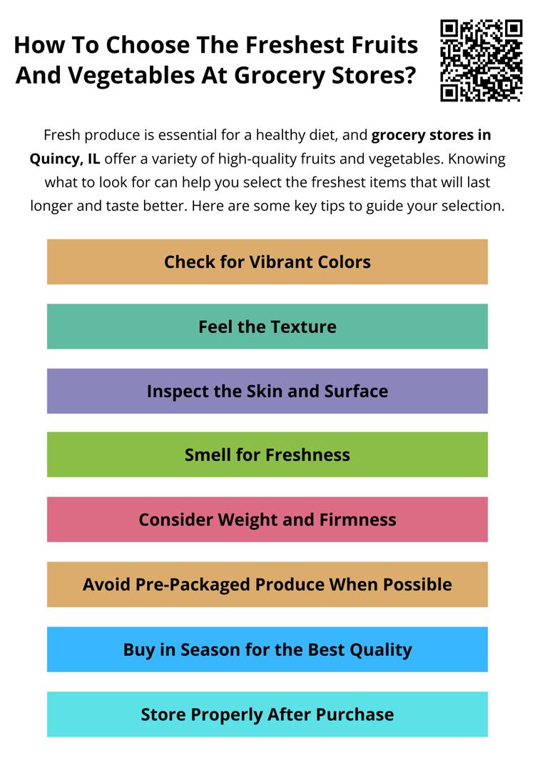 To choose the freshest fruits and vegetables at grocery stores in Quincy, IL, look for vibrant colors, firm textures, and a natural aroma. Avoid bruises, wrinkles, or discoloration. Heavier fruits often indicate juiciness, while crisp greens signal freshness. Shop for seasonal produce and store items properly to maintain quality and flavor. Fresh choices ensure better taste and nutrition.