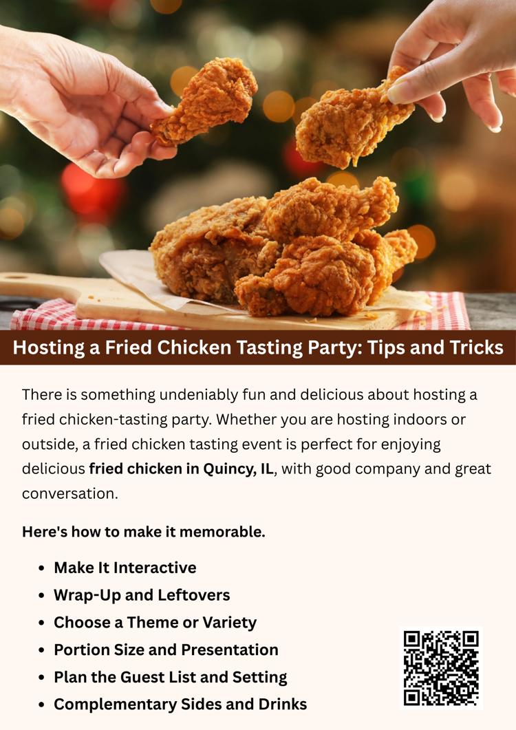 Hosting a fried chicken tasting party is a fun and flavorful way to bring friends together. From choosing a variety of chicken styles to offering classic sides and interactive voting, it is easy to create a memorable experience. Whether you are hosting indoors or outside, a fried chicken tasting event is perfect for enjoying delicious fried chicken in Quincy, IL, with good company and great conversation.