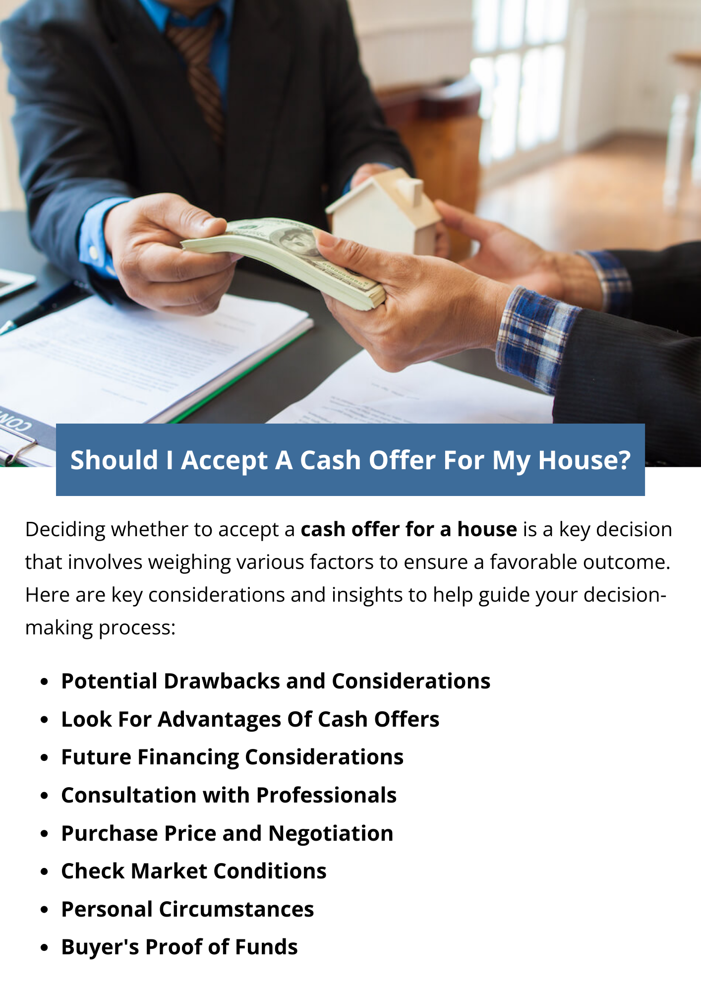 Deciding whether to accept a cash offer for a house depends on factors like market conditions, the buyer's credibility, and your financial goals. Cash offers speed and reliability. Consult with real estate professionals to make an informed decision aligning with your priorities and ensuring a successful transaction.