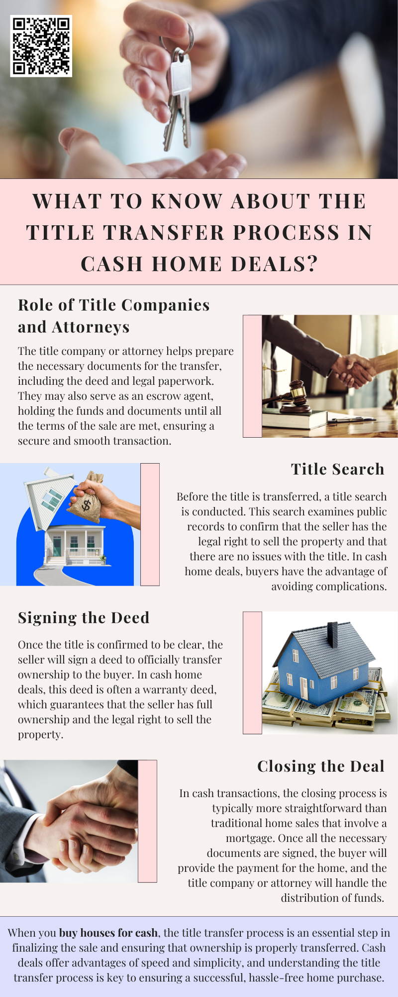 The title transfer process in cash home deals involves transferring ownership from the seller to the buyer once the cash payment is made. A title company or attorney ensures the title is clear of liens and encumbrances. After confirming all legal requirements, the deed is signed, and ownership is transferred. When you buy houses for cash, this process is typically faster and smoother.