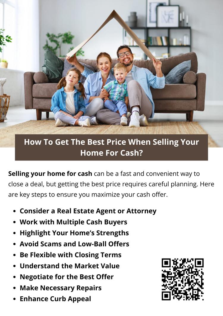 To get the best price when selling your home for cash, research local market trends, get multiple offers, and highlight your property’s best features. Improve curb appeal, make minor repairs, and negotiate strategically. Work with reputable cash buyers and avoid lowball offers. A professional appraisal can help you set a fair price and maximize your profit.