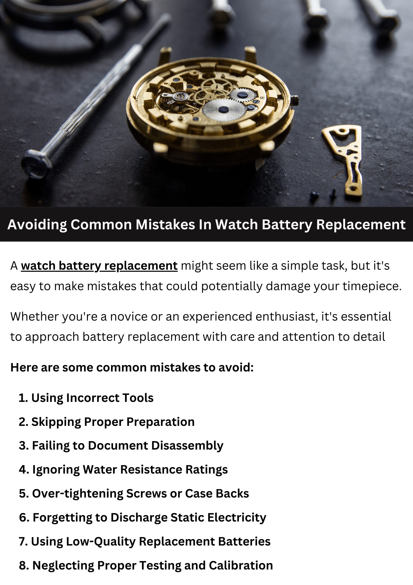 <!--td {border: 1px solid #cccccc;}br {mso-data-placement:same-cell;}-->When replacing a watch battery, avoid common mistakes like using the wrong size battery, mishandling the delicate components, and failing to properly seal the watch. Ensure you have the correct tools and follow instructions carefully to prevent damaging the watch. Take your time and proceed with caution to avoid potential complications or costly repairs. To know more visit here https://www.futerbrosjewelers.com/services/watch-battery-replacement