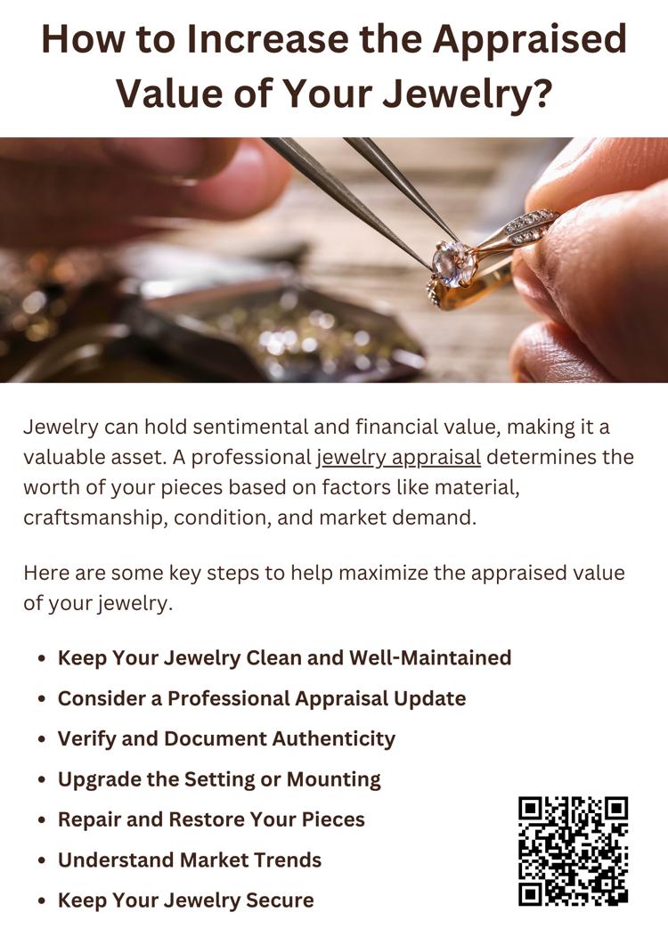 To increase the appraised value of your jewelry, keep it clean, well-maintained, and in good condition. Repair any damage, verify authenticity with certifications, and upgrade settings if needed. Stay informed about market trends and get regular jewelry appraisal updates. Proper storage and security also help preserve value, ensuring your pieces remain a valuable asset for resale, insurance, or investment.