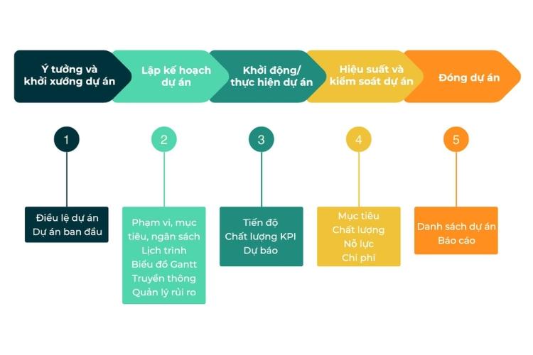 Mặc dù có nhiều phương pháp khác nhau, hầu hết các dự án đều trải qua 5 giai đoạn cơ bản. Đây là khuôn khổ giúp định hướng và kiểm soát toàn bộ quá trình, đảm bảo dự án đi đúng hướng.
