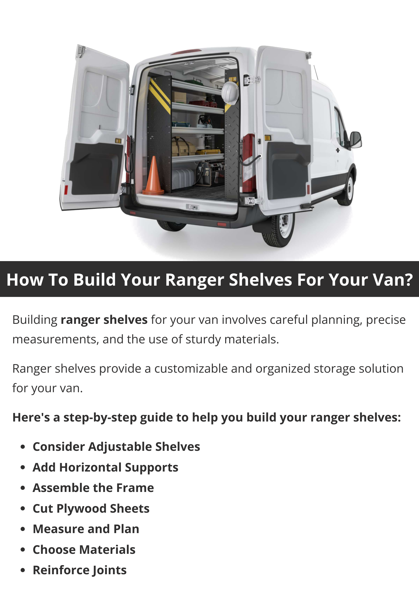 To build ranger shelves for your van, measure the interior dimensions. Select sturdy materials like plywood. Cut the shelves and supports to fit, ensuring a snug fit against the van walls. Assemble the pieces using screws or other secure fasteners. Install the shelves securely, ensuring they can withstand the demands of transporting tools and equipment.