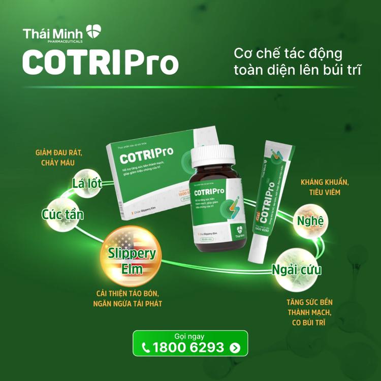Ngoài việc cải thiện chế độ ăn uống và sử dụng các thực phẩm trị bệnh trĩ, người bệnh cũng có thể cân nhắc sử dụng các sản phẩm hỗ trợ từ thảo dược để điều trị trĩ. Một trong những sản phẩm nổi bật hiện nay là cotripro, viên uống hỗ trợ điều trị bệnh trĩ. Cotripro được chiết xuất từ các thảo dược tự nhiên như diếp cá, nghệ, đương quy và hoa hòe, giúp giảm sưng viêm, làm lành vết thương và cải thiện lưu thông máu tại vùng hậu môn.