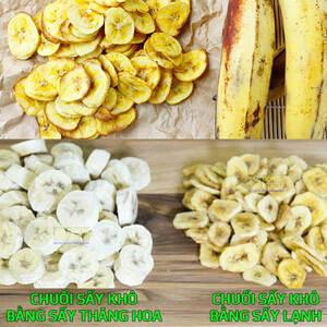 - Chuối sấy giòn: Sử dụng các công nghệ hiện đại như máy sấy thăng hoa hoặc máy chiên chân không để giữ được độ giòn tan, màu vàng sáng bóng, hương vị ngọt tự nhiên và không cháy xém.