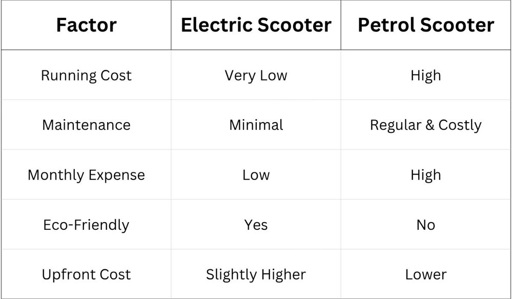 This clearly answers the question: electric scooter vs petrol scooter, which one is better in terms of running cost—electric scooters win by a huge margin.