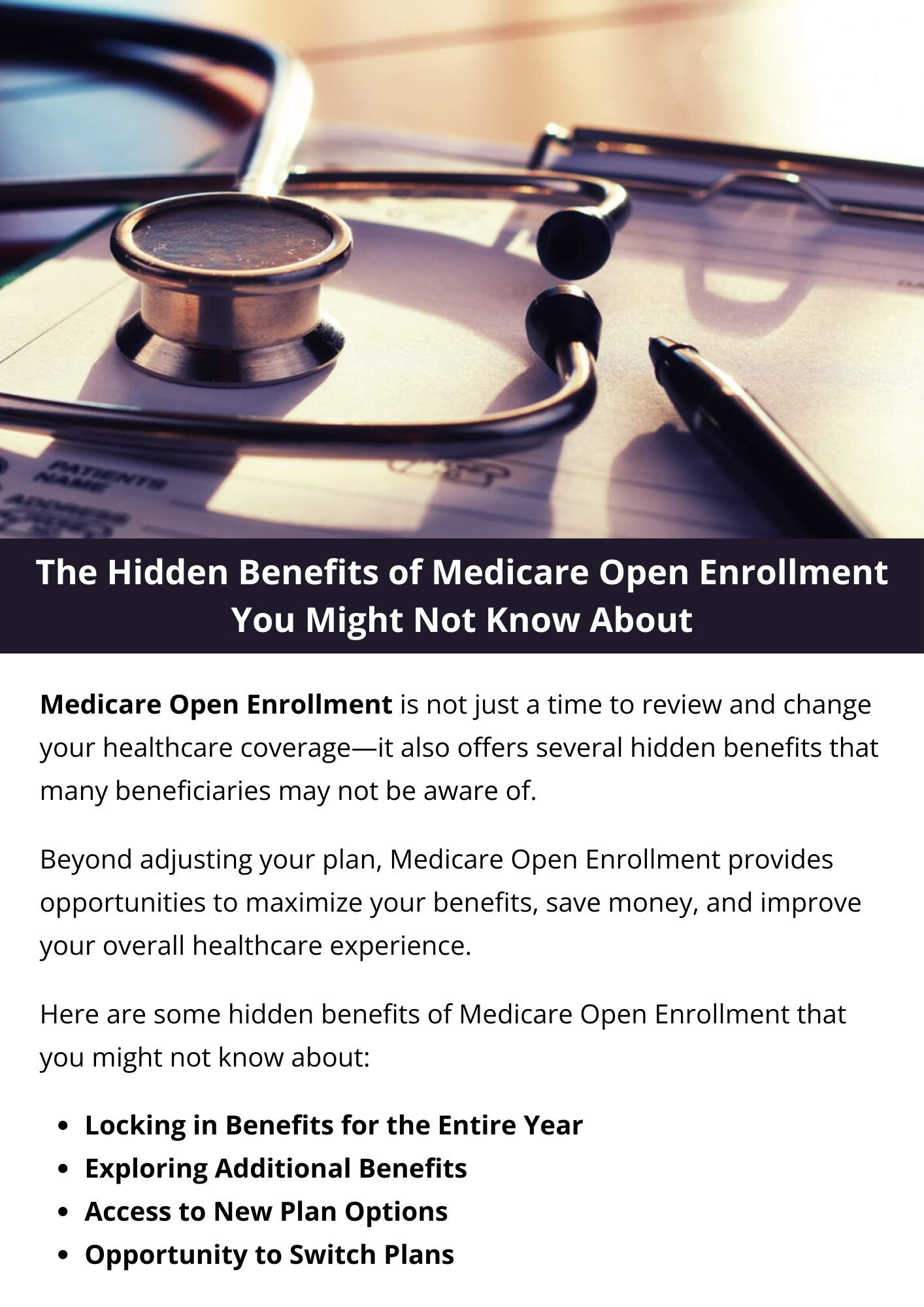 <!--td {border: 1px solid #cccccc;}br {mso-data-placement:same-cell;}-->Medicare Open Enrollment provides chances to explore new plans, access additional benefits, review quality ratings, and save on prescription drugs. It allows switching between Original Medicare and Medicare Advantage, reevaluating healthcare needs, and seeking personalized assistance. These benefits help optimize coverage and improve overall well-being.