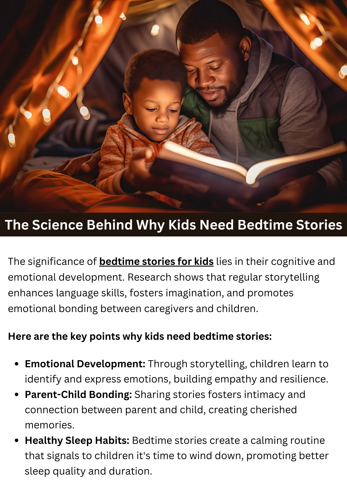 The significance of bedtime stories for kids lies in their cognitive and emotional development. Research shows that regular storytelling enhances language skills, fosters imagination, and promotes emotional bonding between caregivers and children. Through engaging narratives, kids explore new worlds, learn valuable life lessons, and develop a lifelong love for reading and storytelling.