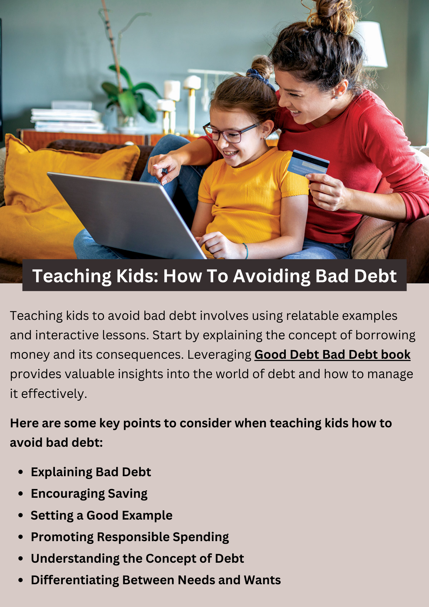 <!--td {border: 1px solid #cccccc;}br {mso-data-placement:same-cell;}-->Teaching kids to avoid bad debt involves using relatable examples and interactive lessons. Start by explaining the concept of borrowing money and its consequences. Use scenarios like buying toys with saved allowance versus using a credit card with high interest. Emphasize the importance of saving and responsible spending habits to prevent bad debt accumulation. To know more visit here https://inflationeducation.net/product/good-debt-bad-debt-and-the-big-green-blob/