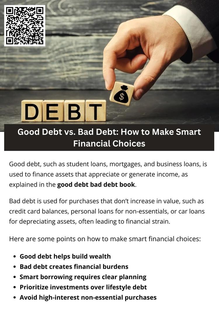 <!--td {border: 1px solid #cccccc;}br {mso-data-placement:same-cell;}-->Understanding the difference between good debt and bad debt is crucial for making smart financial choices. Good debt, like student loans and mortgages, finances investments that appreciate or generate income. The Good Debt, Bad Debt book offers valuable insights on managing debt wisely, helping individuals make informed decisions for long-term financial success.