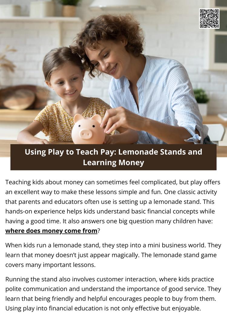 Incorporating play into financial education is not only effective but also enjoyable. The lemonade stand is a fun, engaging way for kids to learn where does money comes from, how it flows, and why it matters. By encouraging curiosity and hands-on learning, parents and educators can give children a strong foundation for future money management skills.