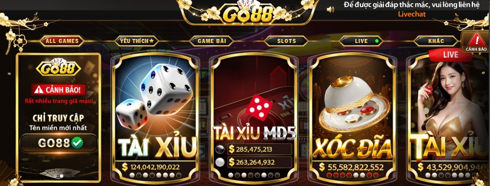 Go88 là cổng game bài uy tín đẳng cấp hàng đầu Châu Á, mang đến trải nghiệm giải trí đa dạng với các trò chơi cá cược hấp dẫn như Game bài, Casino, Xổ số, Thể thao, Nổ hũ, Bắn cá,... và tỷ lệ cược cao nhất hiện nay. Hệ thống bảo mật mã hoá an toàn tuyệt đối, các chương trình khuyến mãi phong phú, cùng đội ngũ hỗ trợ tận tâm 24/7, Go88 cam kết đem lại sự hài lòng tối đa cho người chơi.