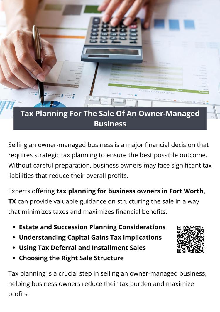 Tax planning is a crucial step in selling an owner-managed business, helping business owners reduce their tax burden and maximize profits. By working with experts offering tax planning for business owners in Fort Worth, TX, sellers can ensure they take full advantage of tax-saving strategies, including capital gains tax relief, tax deferral, and estate planning.