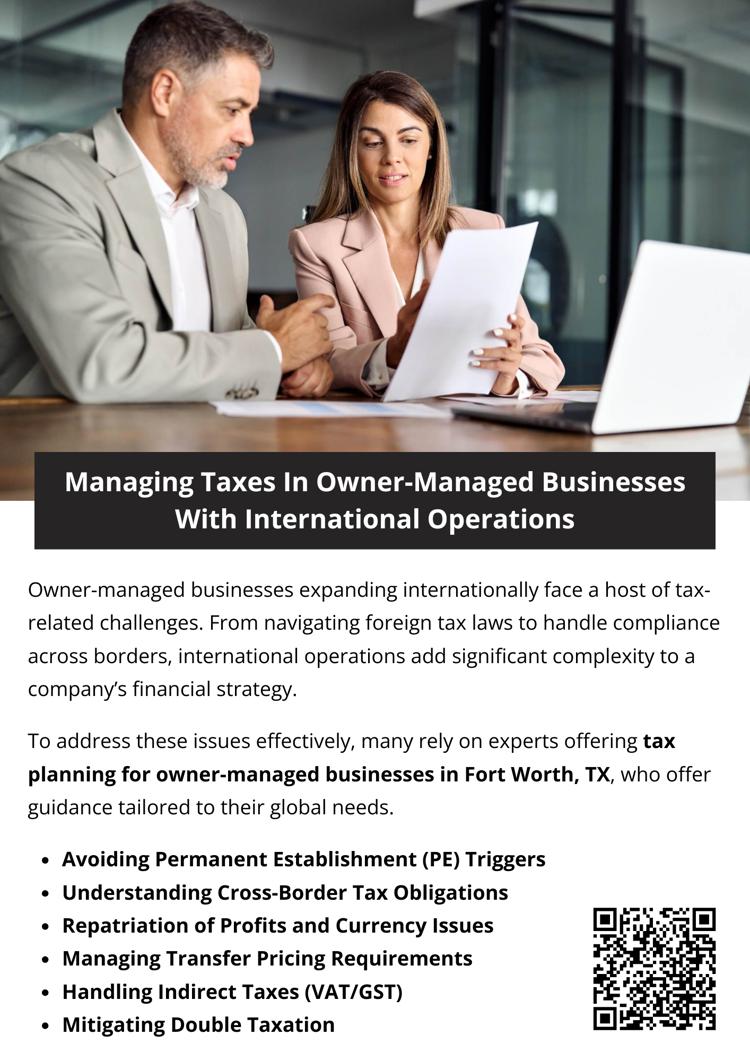 Managing taxes in owner-managed businesses with international operations requires a well-informed, strategic approach. With the help of experienced tax advisors offering tax planning for owner-managed businesses in Fort Worth TX, companies can reduce liabilities, ensure compliance, and support sustainable international growth. Proactive planning not only saves money but also helps businesses avoid costly mistakes in an increasingly global economy.