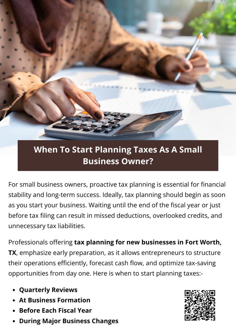 Tax planning is not a once-a-year task but an ongoing process. Small business owners who start early, review finances quarterly, and adjust strategies during major business changes position themselves to save money, remain compliant, and make informed financial decisions. Professionals offering tax planning for new businesses in Fort Worth, TX, can provide the expertise needed to navigate complex tax rules, identify opportunities, and implement strategies tailored to your unique business needs.