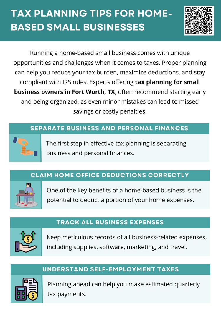 Effective tax planning for home-based small businesses requires organization, knowledge, and proactive management. By separating finances, tracking expenses, claiming deductions correctly, and leveraging available credits, you can minimize tax liability and maximize profitability. Experts offering tax planning for small business owners in Fort Worth, TX, provide valuable guidance, ensuring compliance and helping business owners make strategic financial decisions that support long-term growth.