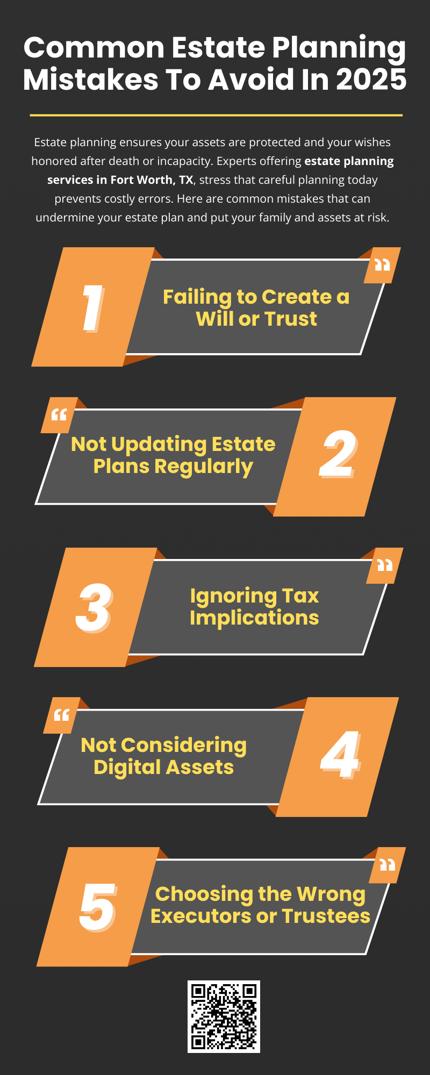 Avoiding the common estate planning mistakes ensures that your assets are protected, your wishes are honored, and your loved ones are supported. By creating a comprehensive, up-to-date plan, addressing taxes, powers of attorney, and digital assets, and seeking professional guidance from experts offering estate planning services in Fort Worth, TX, you can achieve peace of mind knowing your estate is in order. Proper planning today prevents complications and conflicts tomorrow, securing a legacy that aligns with your intentions.