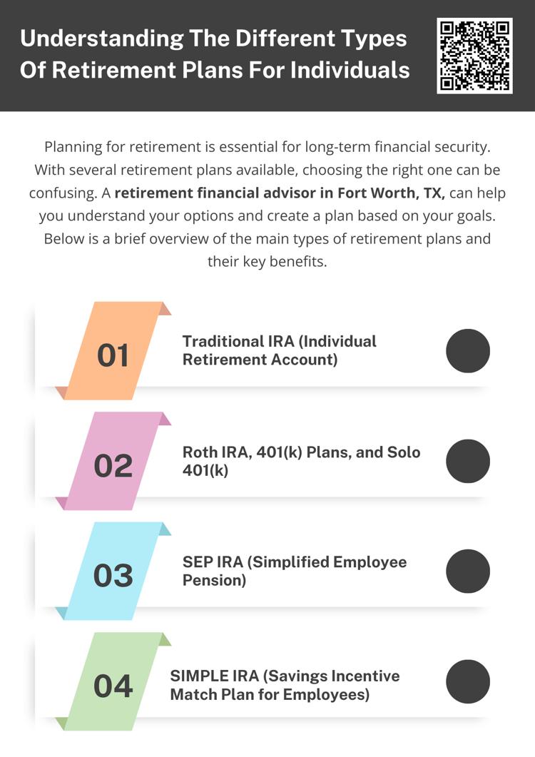 Understanding the differences among retirement plans is essential for making informed financial decisions. Whether you’re employed, self-employed, or a small business owner, there’s a plan to fit your needs. Consulting a retirement financial advisor in Fort Worth, TX, can help you evaluate your current financial situation, forecast future income needs, and choose the most effective retirement plan to secure your future.
