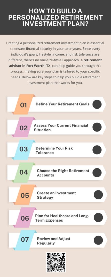 To build a personalized retirement investment plan, define your retirement goals, assess your finances, determine your risk tolerance, and choose suitable retirement accounts. Diversify your investments and adjust your plan regularly as life changes. A retirement advisor in Fort Worth, TX, can help tailor a strategy that fits your needs, ensuring you're on track for a secure and comfortable retirement.
