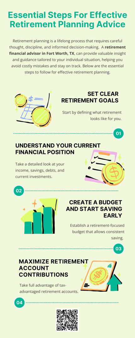 To build a personalized retirement investment plan, define your retirement goals, assess your finances, determine your risk tolerance, and choose suitable retirement accounts. Diversify your investments and adjust your plan regularly as life changes. A retirement advisor in Fort Worth, TX, can help tailor a strategy that fits your needs, ensuring you're on track for a secure and comfortable retirement.