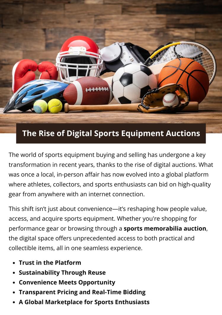 Digital sports equipment auctions have revolutionized how athletes and collectors shop. Offering convenience, global access, and competitive pricing, these platforms allow users to bid on high-quality gear from anywhere. With features like real-time bidding and item transparency, online auctions are becoming a preferred way to buy everything from everyday equipment to rare finds—including sports memorabilia auction items.