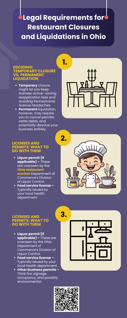 Closing a restaurant in Ohio involves meeting legal requirements such as notifying employees, settling debts, and complying with tax regulations. Many owners choose an Ohio restaurant auctions to liquidate equipment and assets efficiently. This process ensures legal compliance, maximizes returns, and provides a smooth transition while avoiding potential legal disputes during the closure.