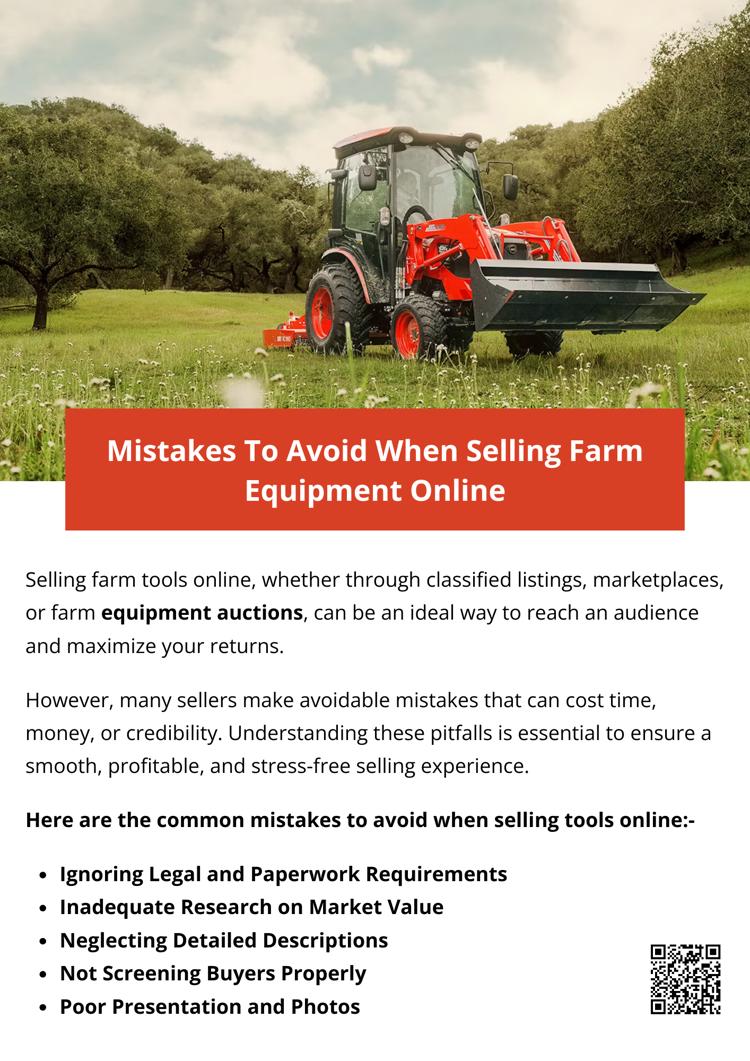 When selling farm equipment online, including through farm equipment auctions, avoid common mistakes. Don’t skip researching market value or pricing accurately. Use clear photos and detailed descriptions, and ensure all paperwork is ready. Screen buyers carefully, plan transport logistics, and don’t rush the sale. Transparency, preparation, and patience help secure a safe and profitable transaction.