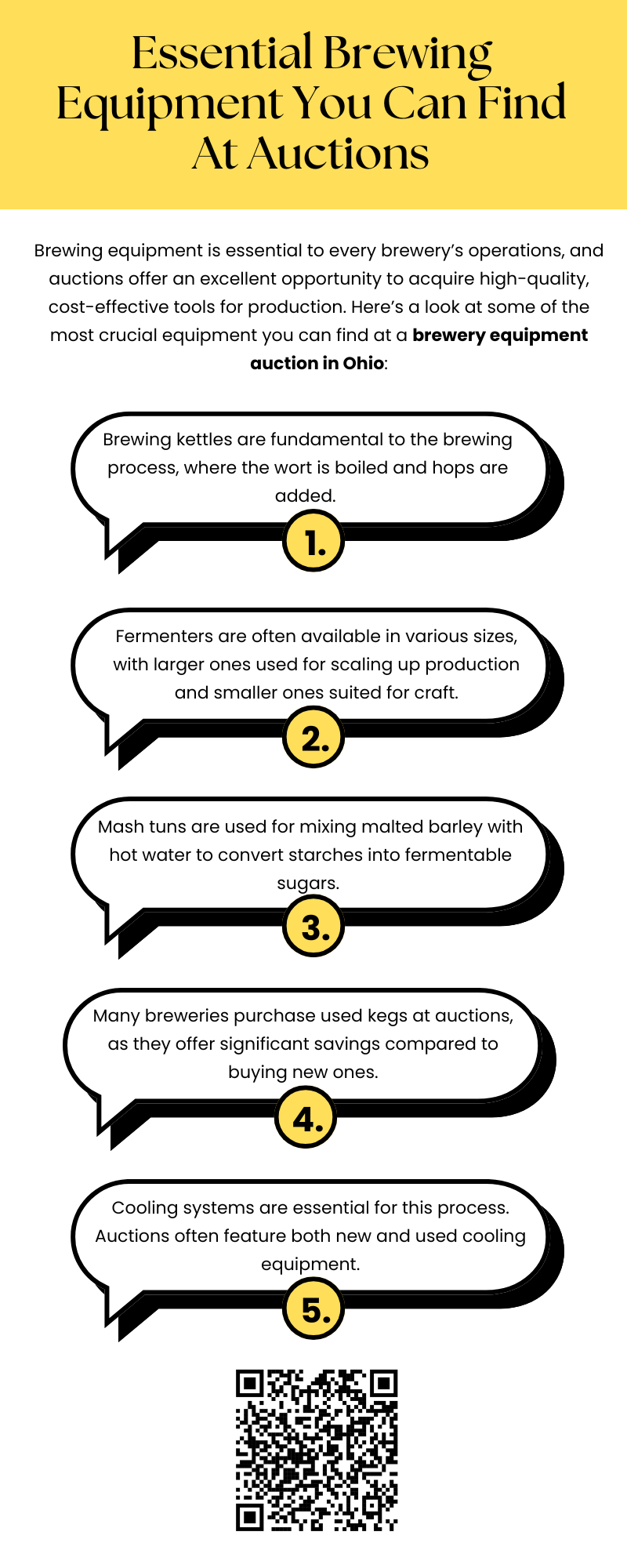 Brewing equipment auctions are an excellent source of essential brewing equipment, from mash tuns and fermenters to kegs and pumps. By carefully evaluating the condition of each piece of equipment and considering your brewing needs, you can find high-quality tools to help grow your business.