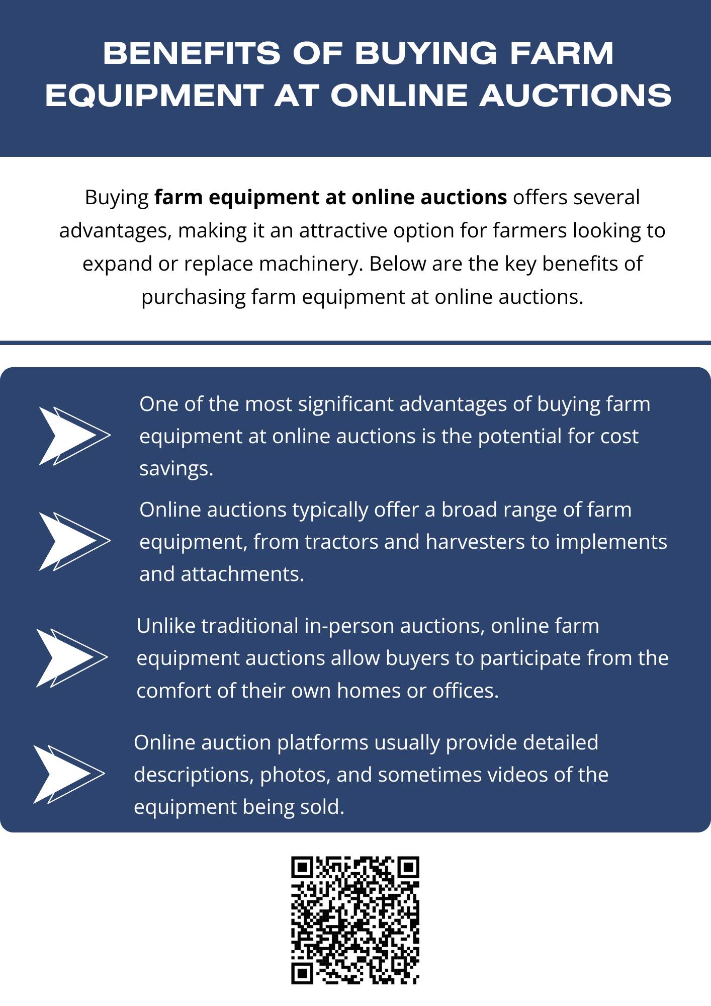 Buying farm equipment at online auctions offers several benefits. It allows farmers to access a wide range of machinery and tools at competitive prices, often below market value. Online auctions provide convenience, enabling farmers to bid from anywhere, saving time and reducing logistical challenges. Additionally, auctions often feature well-maintained equipment from reputable sellers, ensuring quality purchases for agricultural operations.