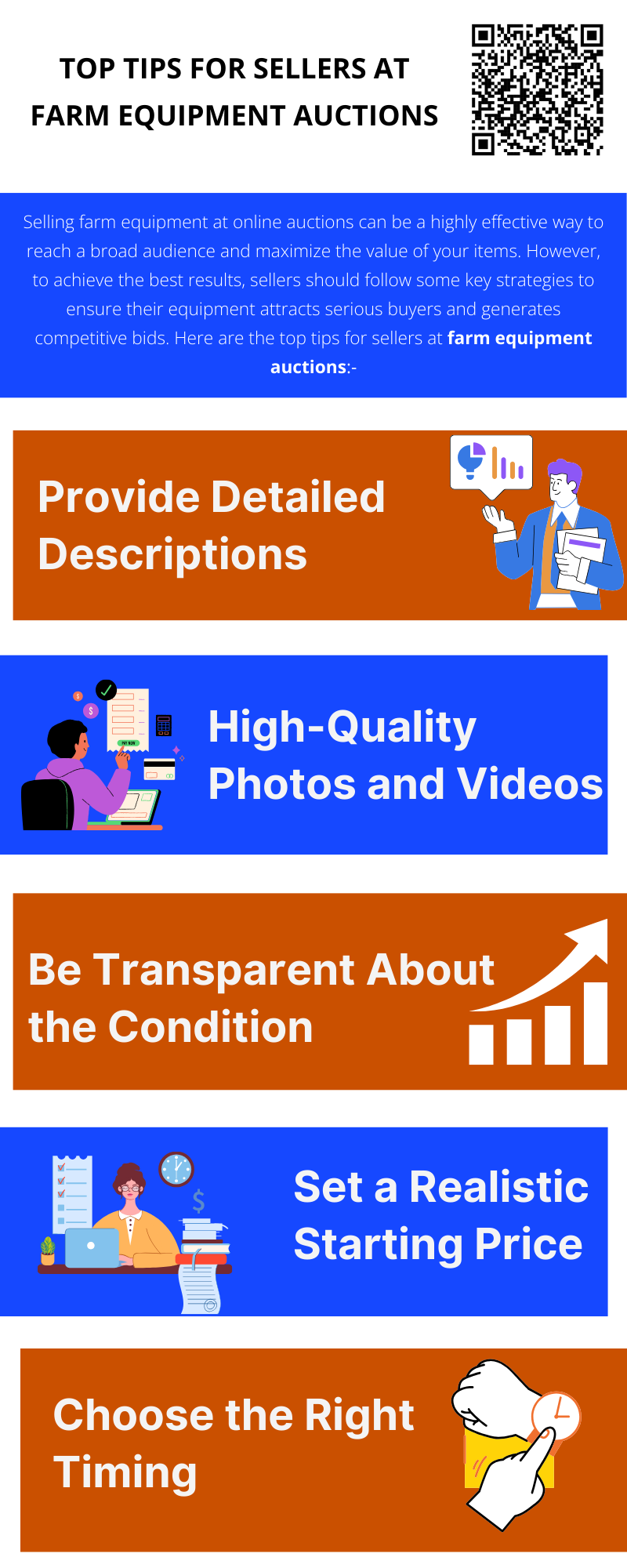Sellers at farm equipment auctions should ensure their equipment is clean, well-maintained, and in good working order to attract buyers. Providing accurate, detailed descriptions and clear photos can help build trust. Set a realistic starting bid to generate interest. Additionally, consider timing your auction to match peak demand periods. Finally, engage in marketing efforts to increase visibility and attract more bidders.