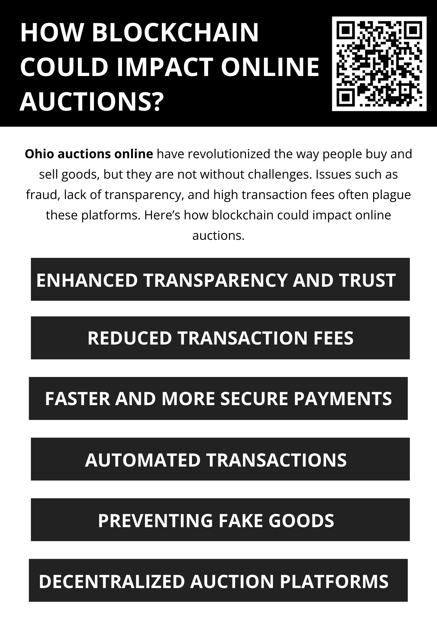 Blockchain technology has the potential to revolutionize Ohio online auctions by increasing transparency, reducing fraud, lowering transaction fees, and ensuring secure payments. As the adoption of blockchain grows, we may see a shift toward decentralized, trustless auction systems that benefit both buyers and sellers.