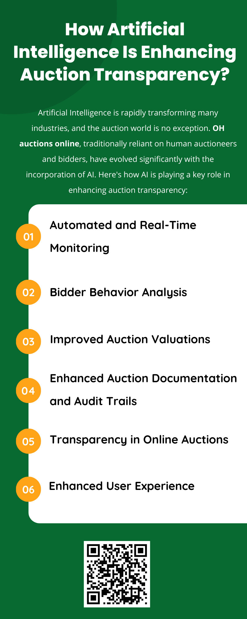 AI is revolutionizing the auction industry by enhancing transparency in multiple ways. From real-time monitoring and bidder behavior analysis to more accurate valuations and secure audit trails, AI is helping to create a more transparent, fair, and accountable auction process. As AI continues to evolve, its role in OH auctions online will only become more integral, further ensuring that auctions remain trustworthy and reliable platforms for both buyers and sellers.
