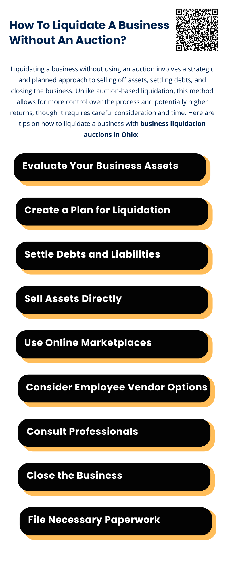 Liquidating a business with business liquidation auctions in Ohio requires careful planning, effective sales strategies, and professional advice. By methodically selling assets and settling liabilities, you can maximize returns, minimize financial risks, and close your business in an orderly and legally compliant manner. While this approach can be more time-consuming than an auction, it provides a controlled environment that may better suit certain business owners.