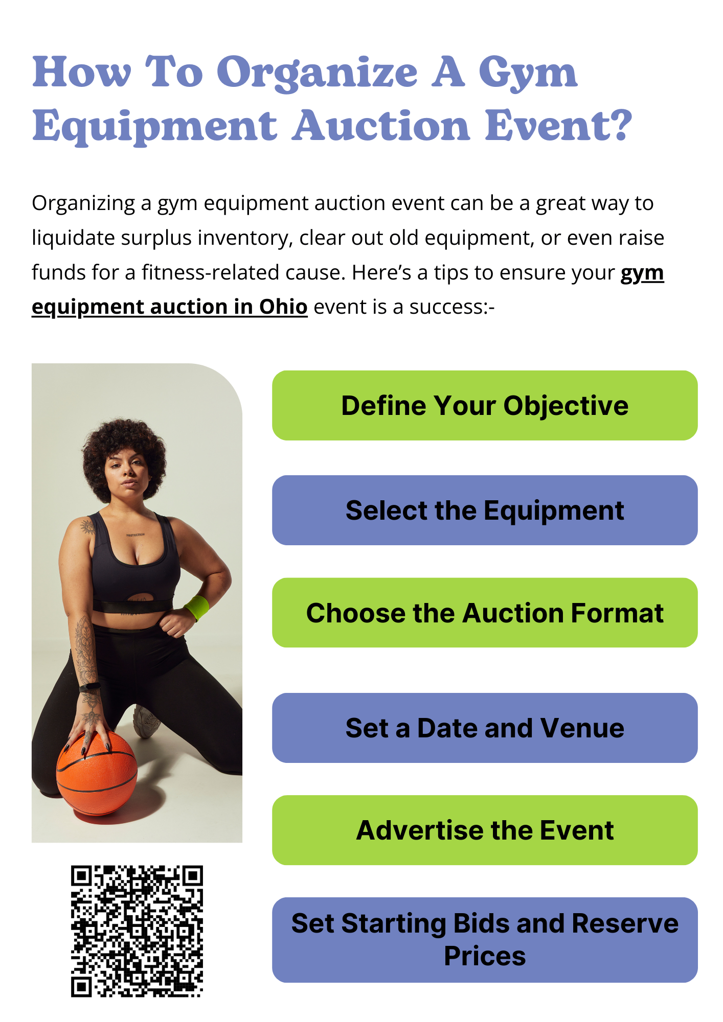 To organize a successful gym equipment auction in Ohio event, start by sourcing high-quality items, and ensuring proper inspections and maintenance. Choose a reputable auctioneer and set a clear auction date. Advertise via social media, local gyms, and community centers to attract attendees. Set a reasonable starting bid, offer detailed descriptions, and ensure smooth registration and payment processes for buyers.