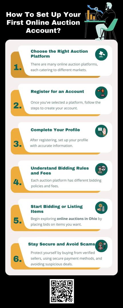 <!--td {border: 1px solid #cccccc;}br {mso-data-placement:same-cell;}-->To set up your first online auction account you have to Choose a trusted platform, provide personal and payment details, and customize your profile preferences. For those in Ohio, ensure you're familiar with local regulations and shipping options for online auction in Ohio. Once your account is ready, start listing items and bidding confidently on auctions.