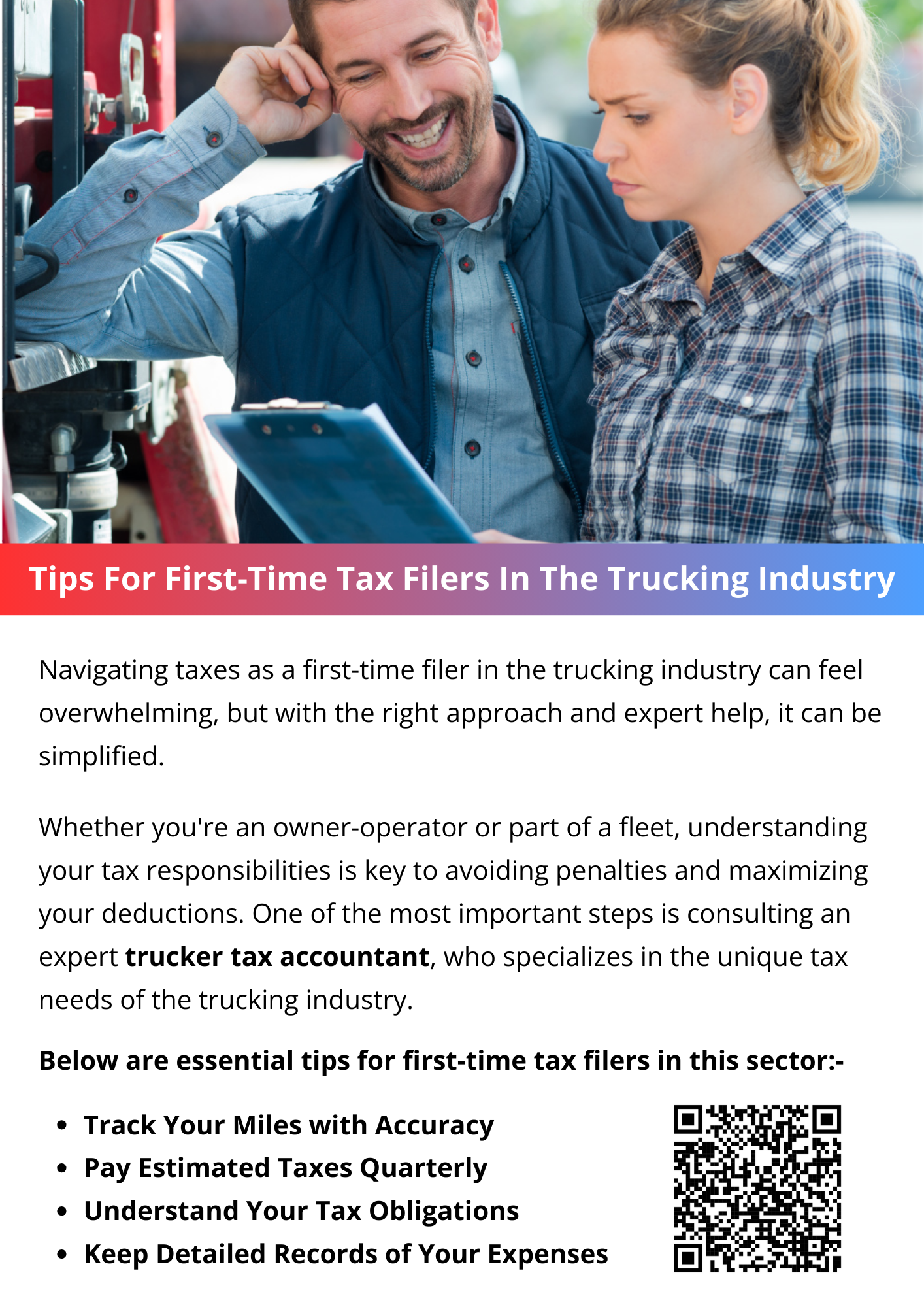First-time tax filers in the trucking industry should keep accurate records of all income and expenses, understand deductible costs like fuel and maintenance, and track mileage meticulously. Consider hiring a knowledgeable truck driver tax accountant for guidance. Familiarize yourself with tax forms, deadlines, and estimated tax payments to avoid penalties. Finally, stay organized and proactive to simplify the filing process.