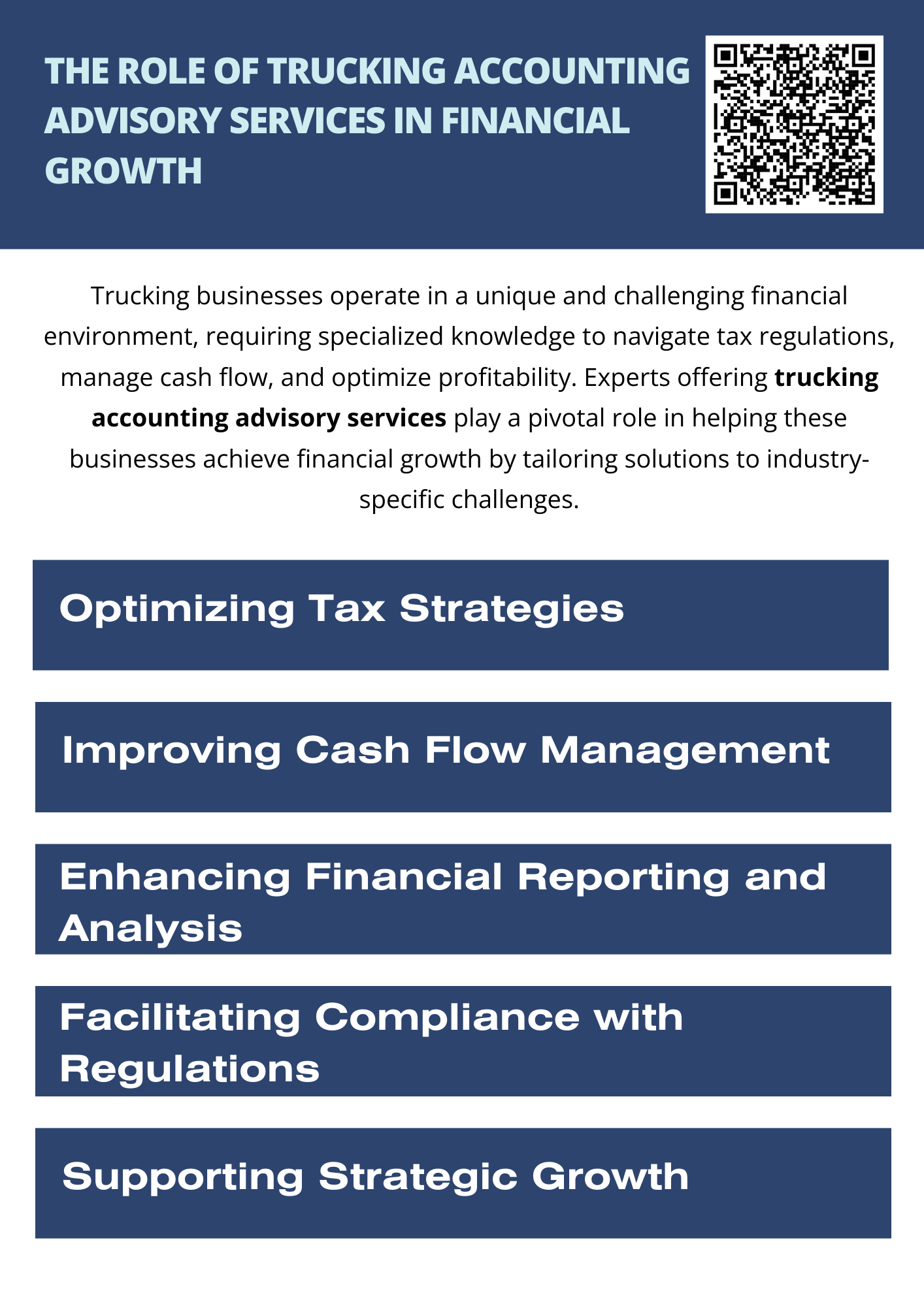 In the highly competitive trucking industry, having the right financial support is crucial for sustained growth. Experts offering trucking accounting advisory services bring a wealth of knowledge tailored to the industry's unique needs, helping businesses optimize tax strategies, manage cash flow, enhance compliance, and plan for the future.
