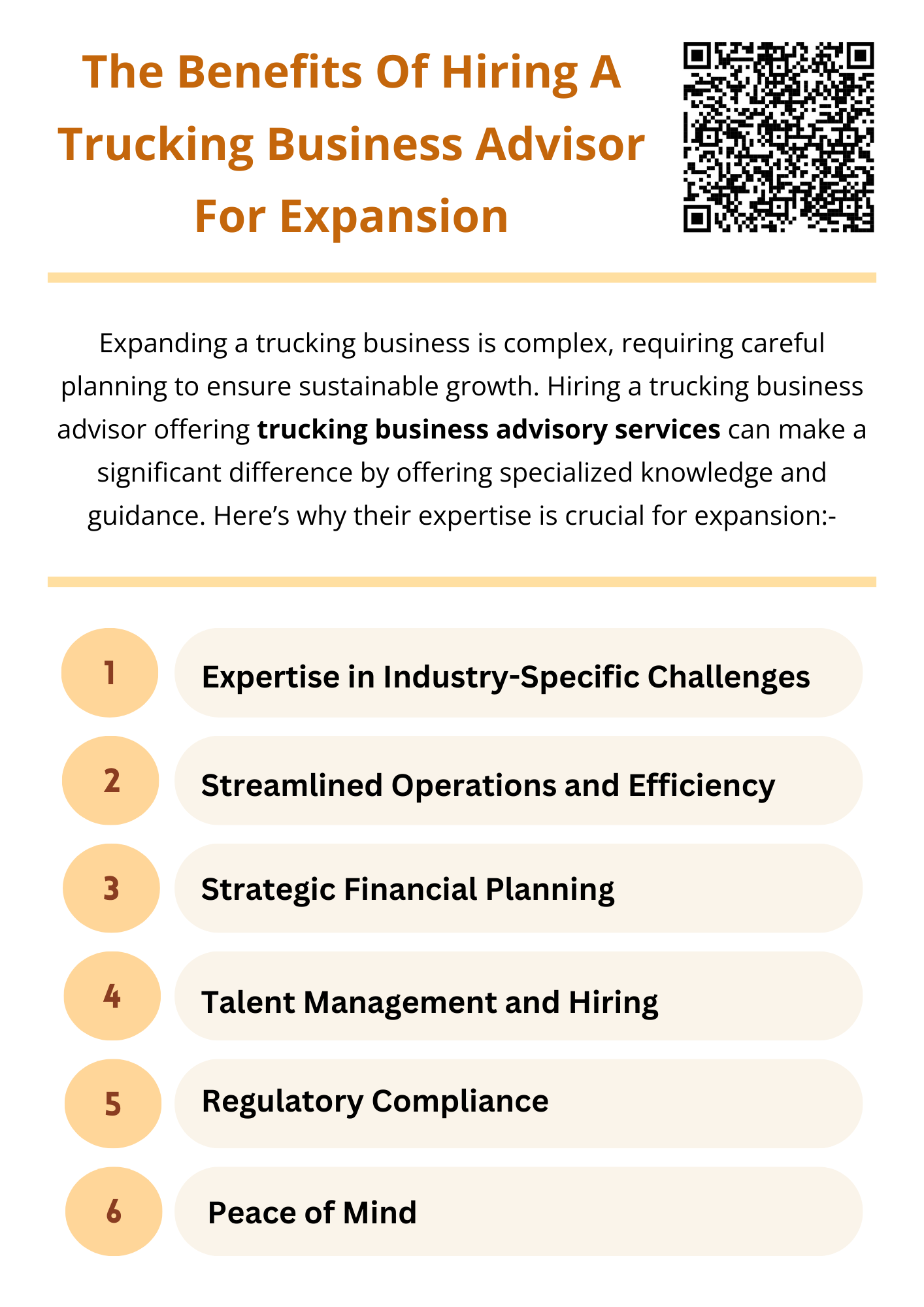 Hiring a trucking business advisor offering trucking business advisory services provides essential support during expansion, offering expertise in financial planning, regulatory compliance, market development, and more. With an advisor’s help, you can make smarter decisions, streamline operations, and grow your business more effectively. Their guidance ensures that your expansion is both profitable and sustainable.