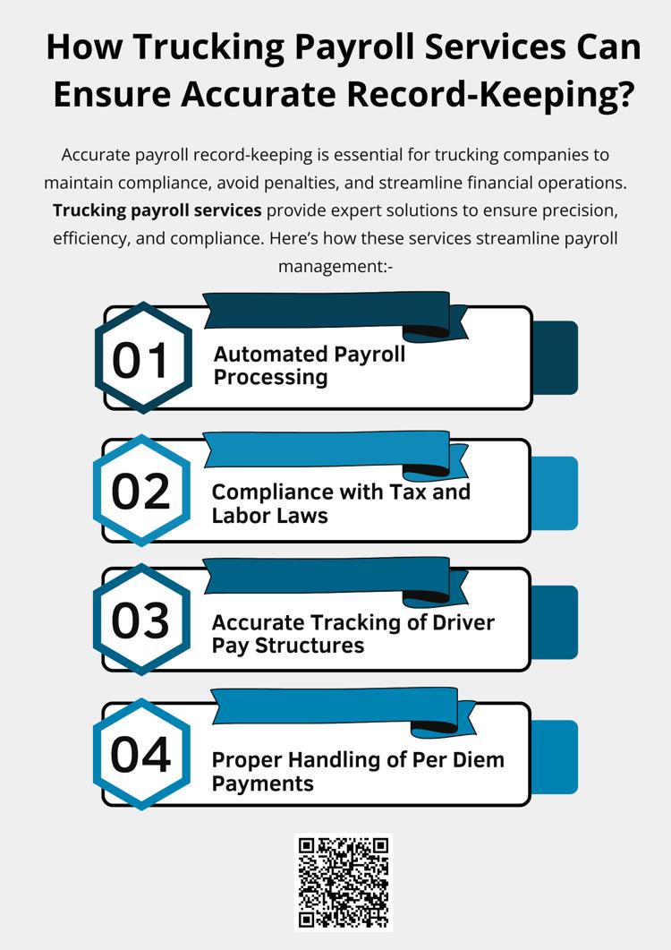 Experts offering trucking payroll services play a vital role in maintaining accurate record-keeping by automating payroll processing, ensuring tax compliance, tracking complex pay structures, and managing per diem payments. By leveraging professional payroll solutions, trucking companies can minimize errors, stay compliant, and focus on business growth without payroll-related worries.