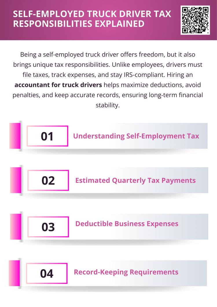Being a self-employed truck driver means managing your own taxes, including tracking income, expenses, and paying self-employment and quarterly estimated taxes. Key deductions include fuel, maintenance, meals, and lodging. Hiring an accountant for truck drivers can simplify record-keeping, maximize deductions, and ensure IRS compliance, helping you save money and avoid penalties while keeping your finances organized.