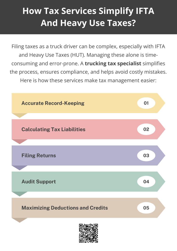 Managing IFTA and Heavy Use Taxes independently can be daunting for truck drivers, but professional guidance from a trucking tax specialist streamlines the process. From accurate mileage tracking to filing returns and maximizing deductions, tax services provide comprehensive support that saves time, reduces errors, and ensures compliance. Partnering with a trucking tax specialist allows drivers to focus on the road while maintaining financial confidence and security.